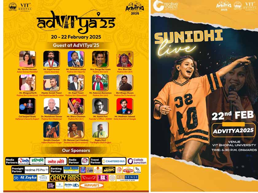 वीआईटी भोपाल विश्वविद्यालय 20 से 22 फरवरी 2025 तक अपने भव्य वार्षिक सांस्कृतिक महोत्सव, अद्वित्या 2025' 2025 की मेजबानी करने के लिए तैयार है। यह शानदार तीन दिवसीय आयोजन 131 विविध आयोजनों को प्रस्तुत करेगा, जिनमें 53 तकनीकी और 59 गैर-तकनीकी प्रतियोगिताएँ, वर्चुअल इवेंट्स और रोमांचक प्रस्तुतियाँ शामिल हैं, जैसे बाइक स्टंट शो, डीजे लहर , रंग-ए-रास डांस नाइट, मध्य प्रदेश गौरव अवार्ड्स, ड्रोन शो, नृत्य, नाटक, क्विज़, टैलेंट हंट और कोडिंग चैलेंजेस। यह आयोजन पूरे राज्य से 20,000 छात्रों की भागीदारी को आकर्षित करेगा, जिससे प्रतिभा प्रदर्शन और सांस्कृतिक आदान-प्रदान का एक अभूतपूर्व मंच बनेगा।