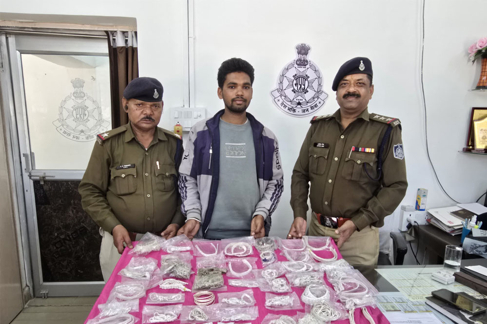 श्रीमान पुलिस अधीक्षक महोदय अनूपपुर श्री मोती उर रहमान जी के निर्देशन में कोतवाली निरीक्षक अरविंद जैन के नेतृत्व में उपनिरीक्षक प्रवीण साहू, प्रधान आरक्षक महेंद्र सिंह, शेख रशीद, रितेश सिंह, महिला आरक्षक अंकिता सोनी और आरक्षक अब्दुल की टीम ने मामले की जांच करते हुए मुख्य आरोपी सोनू सिंह (उम्र 21 वर्ष), निवासी ग्राम छपराटोला, ग्राम लखनपुर, थाना कोतवाली, अनूपपुर को गिरफ्तार किया गया। चोरी के जेवरात खरीदने में शामिल राजेश सोनी (उम्र 48 वर्ष), निवासी वार्ड नंबर 15, सोनी मोहल्ला, पुरानी बस्ती, अनूपपुर, और उसकी पत्नी सुधा सोनी (उम्र 45 वर्ष) को भी गिरफ्तार किया गया। पुलिस ने आरोपियों के कब्जे से 03 लाख रुपए मूल्य के सोने-चांदी के जेवरात बरामद किए, जिनमें पायल, पाजेब, करधन, हाथ की मेहंदी, बच्चों के हाथ और पैर के चूड़े, गले की चेन, ब्रेसलेट, बड़ों के कंगन और चूड़े, और सोने के कान के 5 जोड़ी टॉप्स शामिल हैं।