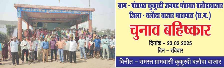 त्रिस्तरीय पंचायत चुनाव के तीसरे चरण में बलौदाबाजार जनपद पंचायत के ग्राम पंचायत कुकुरदी के ग्रामीणों ने चुनाव का बहिष्कार कर दिया है. सांवरा जाति के लोगों को उनके ग्राम पंचायत के वार्ड नंबर 12 में शामिल किए जाने का लगातार विरोध करते हुए चुनाव में मतदान नहीं करने का निर्णय लिया है.