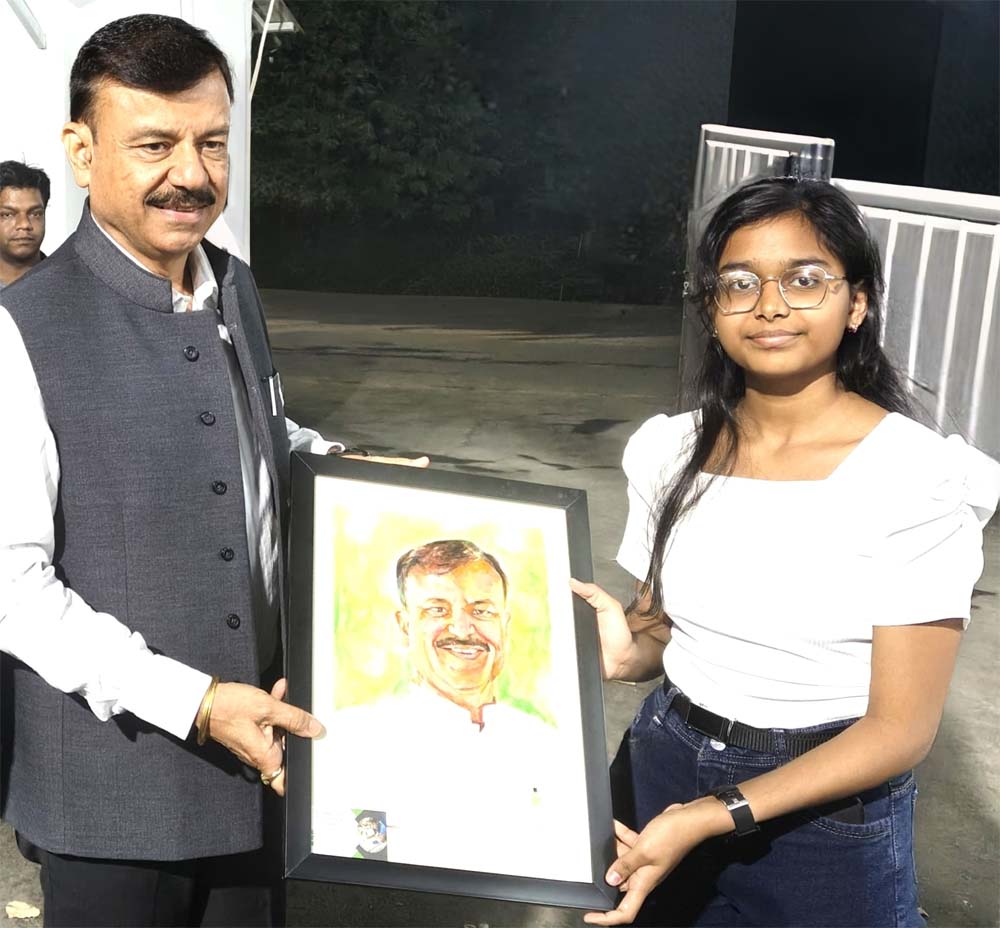 स्कूल शिक्षा मंत्री सिंह को बाल चित्रकार ने भेंट किया उनका चित्र