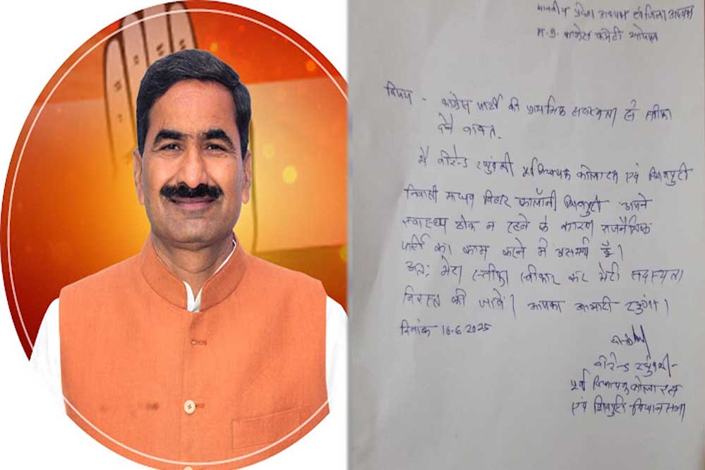 कांग्रेस पार्टी में एक बार फिर से हलचल मचाने वाला घटनाक्रम सामने आया है। कोलारस विधानसभा से पूर्व विधायक और कद्दावर नेता वीरेंद्र रघुवंशी ने सोमवार को अचानक कांग्रेस पार्टी की प्राथमिक सदस्यता से इस्तीफा दे दिया। उन्होंने सोशल मीडिया पर एक पत्र साझा करते हुए इसका कारण "स्वास्थ्य ठीक न होना" बताया है।