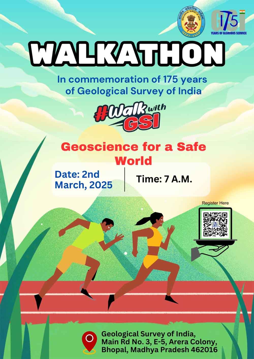 भारतीय भूवैज्ञानिक सर्वेक्षण (GSI) की 175वीं वर्षगांठ के अवसर पर GSI द्वारा 02 मार्च 2025 सुबह 7:00 बजे 3.0 किलोमीटर की वॉकथॉन का आयोजन किया जा रहा है जो बिठ्ठल मार्केट से कैम्पियन स्कूल होते हुए मनीषा मार्केट रोड से वापस होगी व बिठ्ठल मार्किट पर समाप्त होगी। इस वॉकथॉन में रजिस्ट्रेशन के लिए  QR कोड के माध्यम से पंजीकृत कराया जा सकता है।  श्री विजय दुबे, सहायक पुलिस आयुक्त, कार्यक्रम के मुख्य अतिथि रहेंगे ।