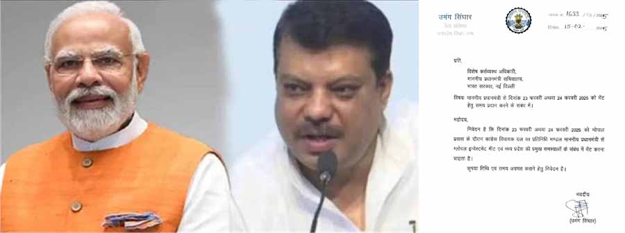 मध्यप्रदेश के नेता प्रतिपक्ष उमंग सिंघार ने प्रधानमंत्री नरेन्द्र मोदी से मिलने और प्रदेश की समस्याओं से उन्हें अवगत कराने के लिए पत्र लिखकर समय मांगा है। पीएम मोदी 23 और 24 फरवरी को भोपाल के दौरे पर आ रहे हैं। इसी को लेकर नेता प्रतिपक्ष ने पत्र लिखकर कहा है कि कांग्रेस विधायकों का प्रतिनिधिमंडल उनसे भेंट करना चाहता है।