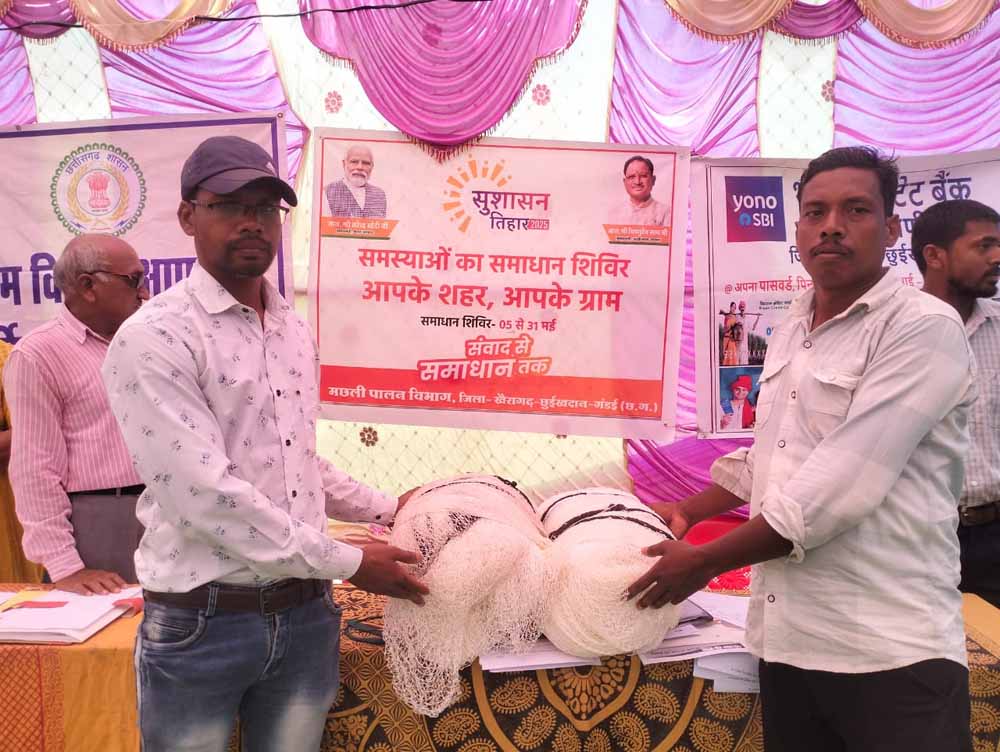 'सुशासन तिहार' के अंतर्गत आयोजित समाधान शिविर में खैरागढ़ विकासखण्ड के ग्राम खपरी तेली और खपरी सिंदर के दो मेहनती ग्रामीणों, रूपलाल निषाद और राजेश निषाद, के जीवन को नई दिशा दी है। इन दोनों मछुआरों ने मछली पालन के लिए शासन से सहायता प्राप्त करने हेतु समाधान शिविर में आवेदन प्रस्तुत किया। उनकी आवश्यकताओं को गंभीरता से लेते हुए प्रशासन ने ग्राम मुढ़ीपार में आयोजित शिविर में उन्हें तुरंत महाजाल (फिशिंग नेट) प्रदान किया।