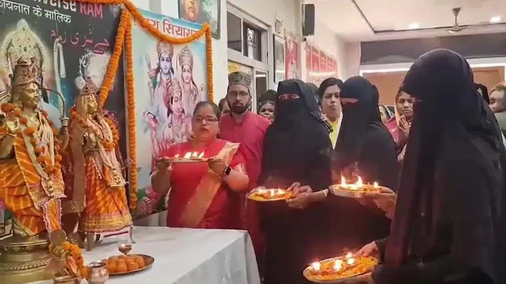 मुस्लिम महिला फाउंडेशन और विशाल भारत संस्थान के संयुक्त तत्वावधान में मुस्लिम महिलाओं की श्रीराम महाआरती का आयोजन लमही के सुभाष भवन में किया. सजावटी थाल, खूबसूरत रंगोली, उर्दू में लिखा जय श्रीराम मुस्लिम महिलाओं की श्रद्धा को व्यक्त कर रहा था. नफरत को भड़काकर हिंदू मुसलमानों के बीच समाज को बांटा जा रहा है.
