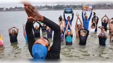 प्रयागराज में योग के प्रति जागरूकता के लिए तैराकी प्रशिक्षक ने लोगों से विभिन्न योग मुद्राओं में जलयोग करवाया