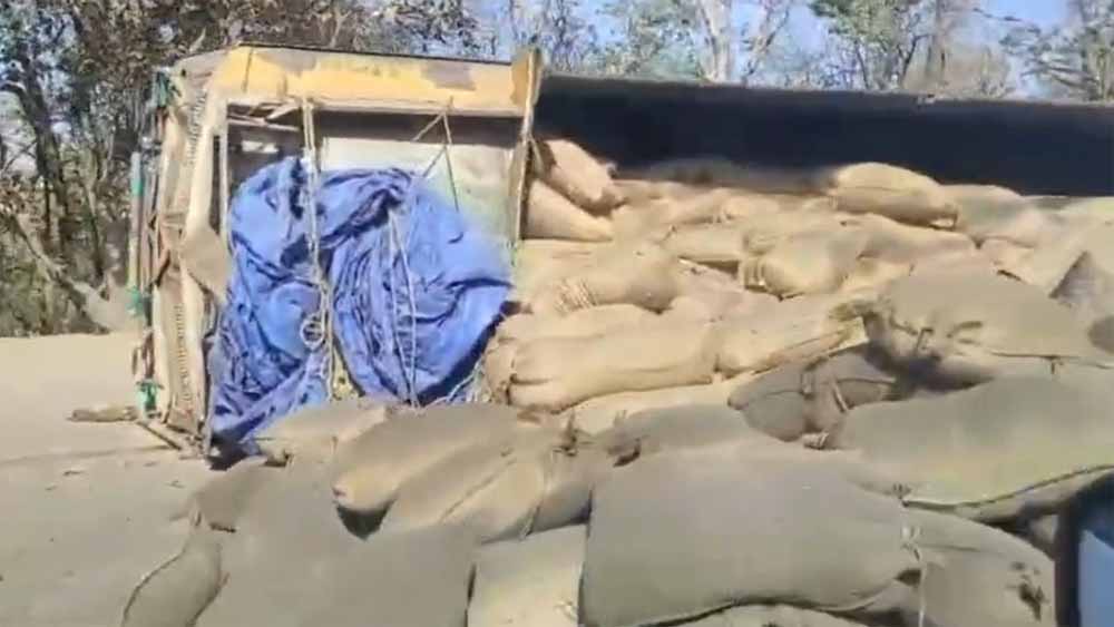 पेंड्रा बिलासपुर मुख्यमार्ग पर धान से लदा ट्रक पलटा