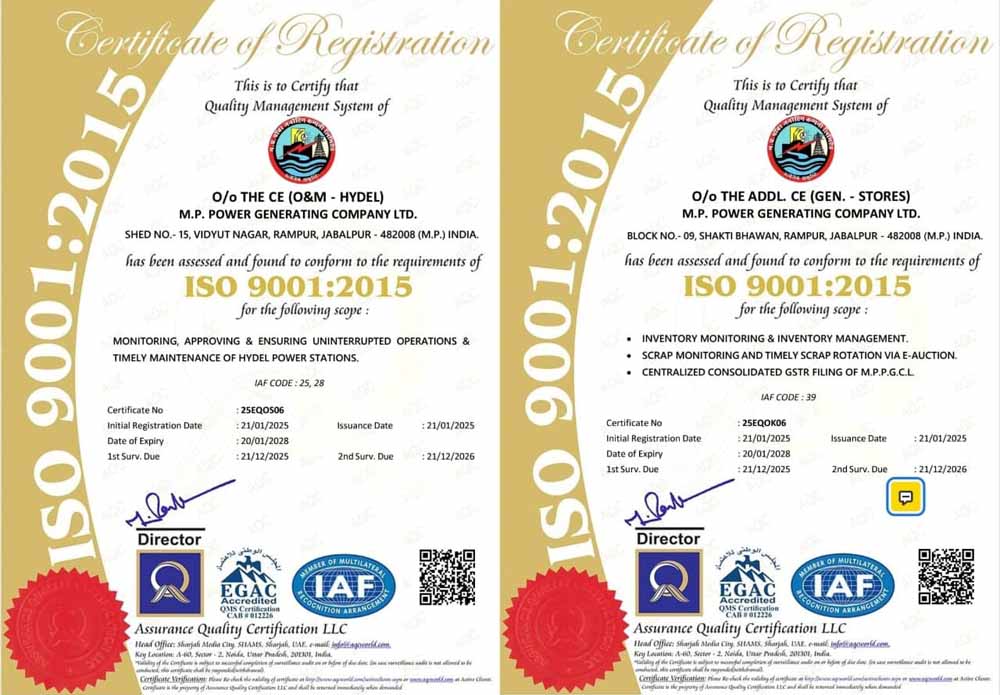 मध्यप्रदेश पॉवर जनरेटिंग कंपनी के मुख्यालय जबलपुर के दो कार्यालयों मुख्य अभियंता उत्पादन भंडार और मुख्य अभियंता संचालन संधारण-जल विद्युत को उत्कृष्ट मानदंडों का पालन करने के लिए अंतर्राष्ट्रीय क्वालिटी मैनेजमेंट सिस्टम 9001:2015 सर्टिफिकेशन प्राप्त हुआ है। मध्यप्रदेश पॉवर जनरेटिंग कंपनी के दो कार्यालयों को आईएसओ सर्टिफिकेशन होने पर ऊर्जा मंत्री श्री प्रद्युम्न सिंह तोमर ने कार्यालयों के समस्त अभियंताओं और कार्मिकों को शुभकामना और बधाई दी। उन्होंने अपेक्षा व्यक्त की कि ये कार्यालय भविष्य में भी इसी प्रकार उच्च स्तरीय क्वालिटी मानदंडों का पालन करते हुए कार्य करेंगे।