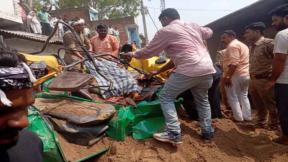 बालू उतारते समय एक डंपर असंतुलित होकर पास से गुजर रहे टेंपो पर पलट गया, तीन की मौत, तीन की हालत नाजुक
